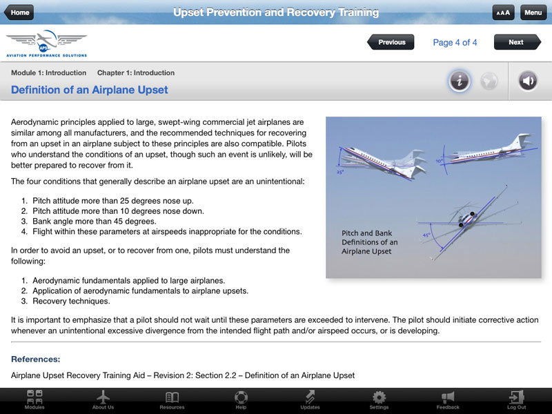 Mesa, Arizona (PRWEB) October 23, 2013 – Aviation Performance Solutions LLC (APS), a USA-based flight school with training centers in Arizona, Texas and Europe, announced today, in partnership with International Development of Technology BV (IDT), and Netherlands-based company, the release of a new airplane upset prevention and recovery training (UPRT) application for iPad. The training content of this dynamic, interactive iPad experience is founded upon the industry-accepted Airplane Upset Recovery Training Aid (AURTA) with modernization for the iPad format. Eight modular chapters cover an introduction to UPRT, aerodynamics, causes of upsets, recovery techniques, and sample training programs.