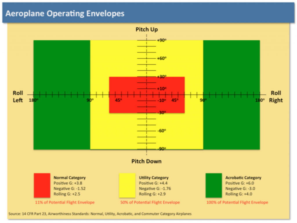 Here is a graph of pitch and roll attitudes that shows the minimum limit loads of the Normal, Utility, and Acrobatic Categories: