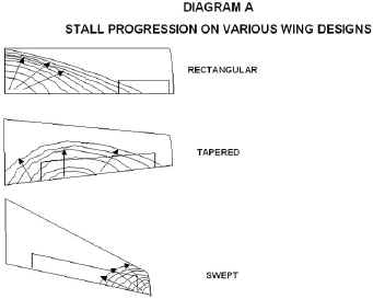 In Diagram A (above), we see several wing shapes. The rectangular and tapered wing shapes are typically what we see in GA aircraft and the swept wing we see in jet aircraft. Notice too that as we begin stalling, part of the wing in each design is still generating lift, e.g. part of the wing is still flying, albeit not very efficiently due to the loss of lift over the stalled area and the associated increase in drag. In fact, if you had a motor powerful enough to overcome the dramatic increase in total drag, you could fly cross-country in a stall (I wouldn't want to pay the gas bill).