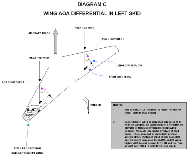 The associated secondary roll due to the yaw input means that the trailing wing (left in this case) has a higher effective AOA than the advancing/rolling right wing (see diagram C). This means that as we approach critical AOA, the trailing wing (left in this case) will likely stall first. Even worse is the fact that as we input right roll to compensate for the secondary left roll effect when applying left rudder, we effectively increase the local AOA on the left wing even farther (left aileron down, right aileron up). This gets the left wing in our example to critical AOA even sooner. But even more interesting is the fact that the left wing in our left skid can now take on some of the characteristics of a swept wing design. Assuming we get a little overzealous with the elevator in this case, where do you think the stall will occur? You got it, it'll happen farther outboard from the wing root, maybe even near the left wingtip first. And where do you suppose any interrupted airflow from boundary layer separation is going to go? It really doesn't matter, because bottom line: it isn't going over the elevator or around the fuselage…no buffet, no warning, Nada!