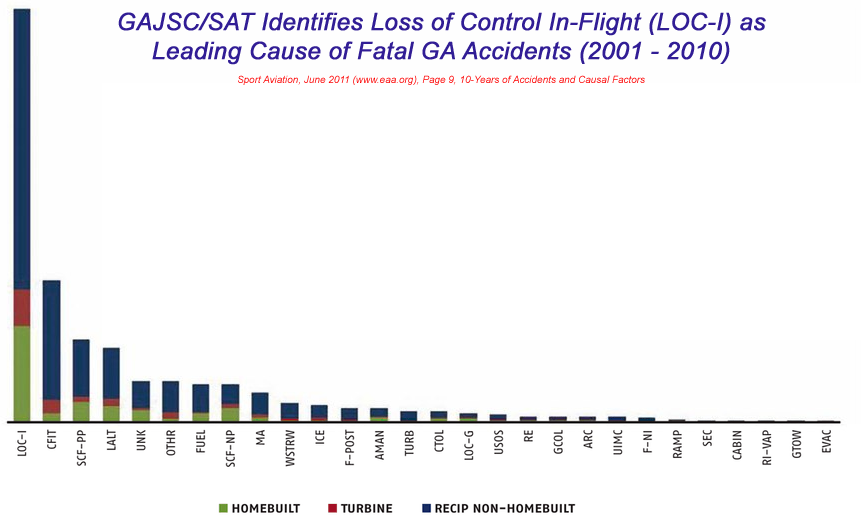Sidebar: The historic focus of stall recovery (from ab initio flight training through to transport category type rating and recurrency training) has repeatedly emphasized minimizing altitude loss. As is the case for loss of control in-flight for commercial pilots, general aviation pilots need to understand that GA Loss of Control In-Flight (LOC-I) is the leading cause of fatalities for them as well (see chart to right). Nearly half of those fatal accidents begin with the aerodynamic stall. Thanks to the major manufacturers responding to the fatal consequences of mis-prioritizing altitude loss as 'the' most important consideration in a stall during training, stall recovery techniques and strategies are being upgraded throughout the aviation industry to give primary focus to regaining and maintaining aircraft control. If that seems like it should be obvious, it is not obvious to a pilot startled in an upset or stall event. Sadly, there are many fatal accidents (including very recent ones) where mis-prioritization of minimizing altitude loss as been identified as negative training. This is often characterized by the accident pilot(s) instinctively pulling back on the control column in a stall (and keeping it back) despite a litany of aerodynamic cues, stall warning cues and negative stability handling characteristics clearly identifying the situation as a stall ... the stall must be fixed by reducing angle of attack irrespective of altitude, airspeed or flight attitude. Re-enter the 'push' or 'unload' concept once again ...